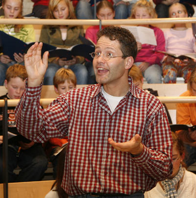 | Da auch er einen Hang zum Theater hat, wollte er mit seinen kleinen Sängern Kindermusicals einüben, fand aber, dass die Auswahl der angebotenen Stücke nicht groß genug sei und so entstand die Idee, selbst welche zu verfassen, was wir bis heute mit viel Freude und Erfolg zusammen tun. |